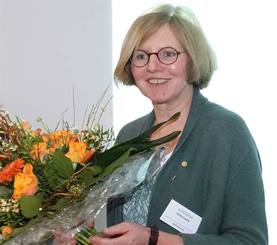 Mit Anerkennung und Dank zeichnete der Vorsitzende des Bundes deutscher Staudengärtner, Michael Moll die Staudenexpertin Ulrike Leyhe mit der Goldenen Ehrennadel aus.